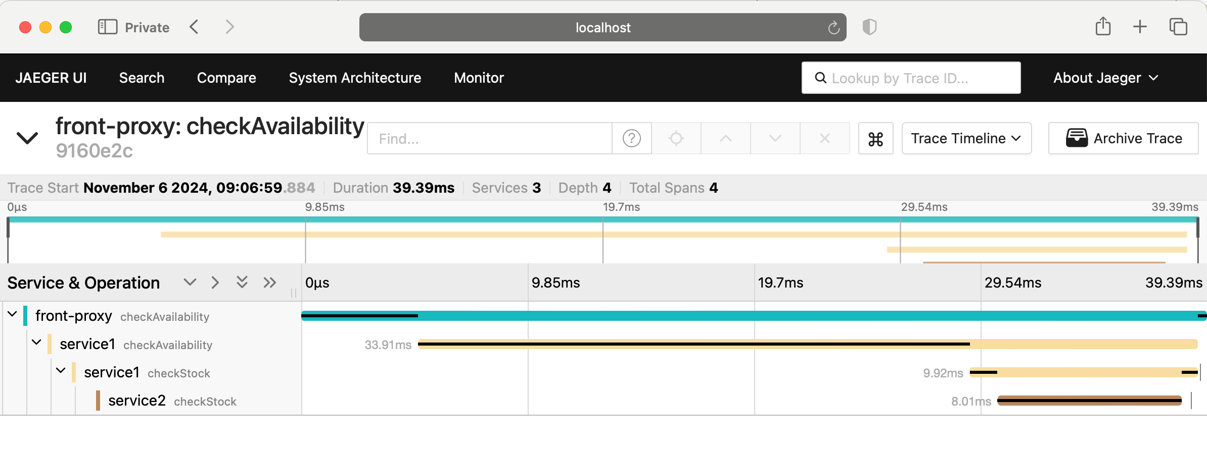 Point your browser to http://localhost:16686 . You should see the Jaeger dashboard. Set the service to “front-proxy” and hit ‘Find Traces’. You should see traces from the front-proxy. Click on a trace to explore the path taken by the request from front-proxy to service1 to service2, as well as the latency incurred at each hop.